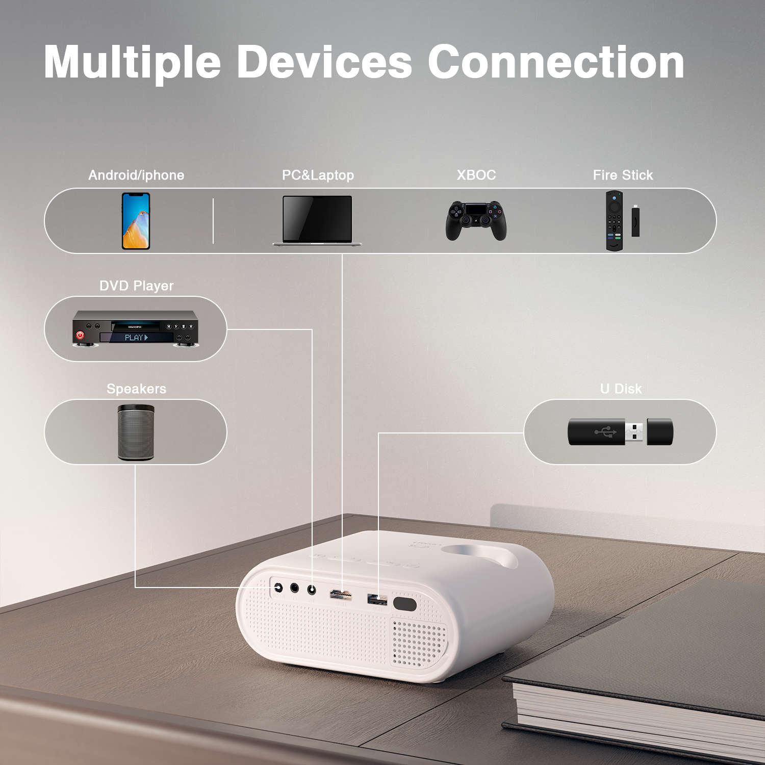 | 【Multi-device compatible - one-click connection】This mini projector is equipped with HDMI / USB / AV / 3.5mm audio interface, supports connecting mobile phones, tablets, laptops, Switch, PS5, TV boxes, USB flash drives and other devices, plug and play! It is an excellent movie projector. Note: Due to copyright restrictions, Netflix/Disney+/Hulu needs to be played through a TV stick, and an additional HDMI adapter is required for mobile phone connection. |